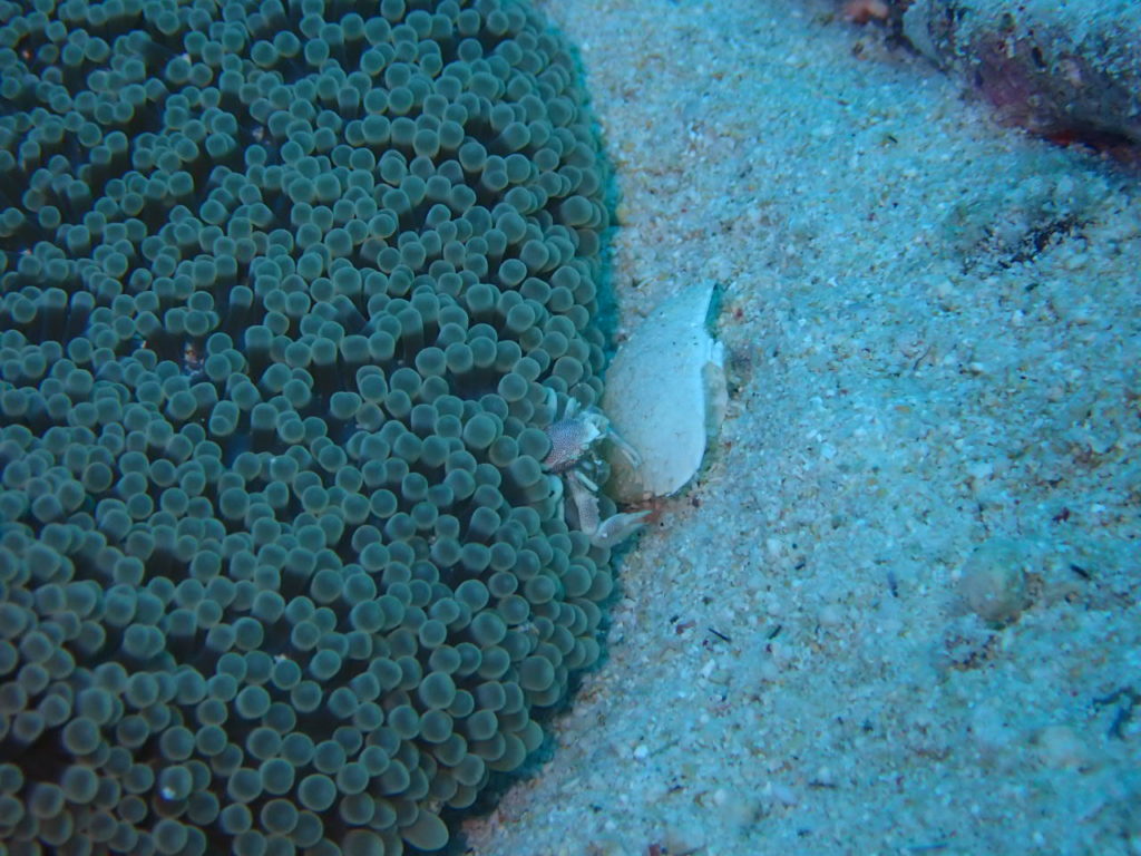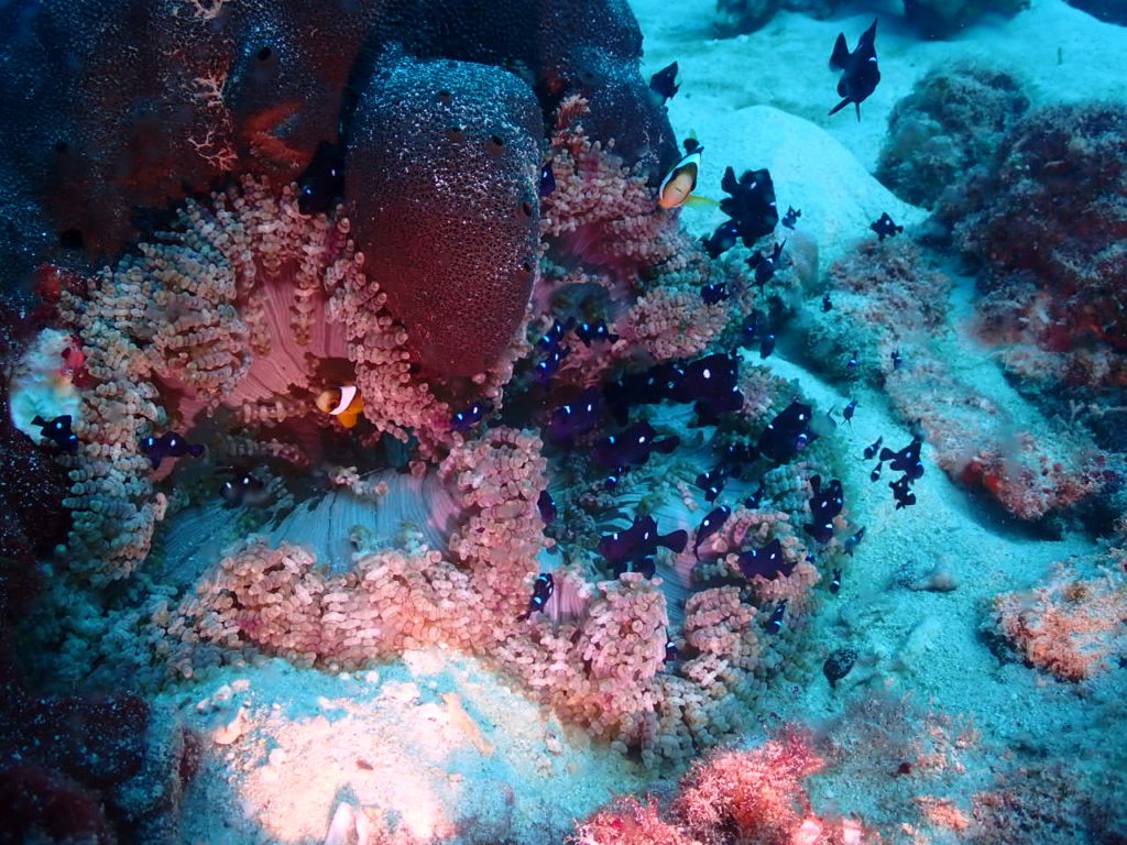 ミツボシクロスズメに包まれたイソギンチャクを眺め、